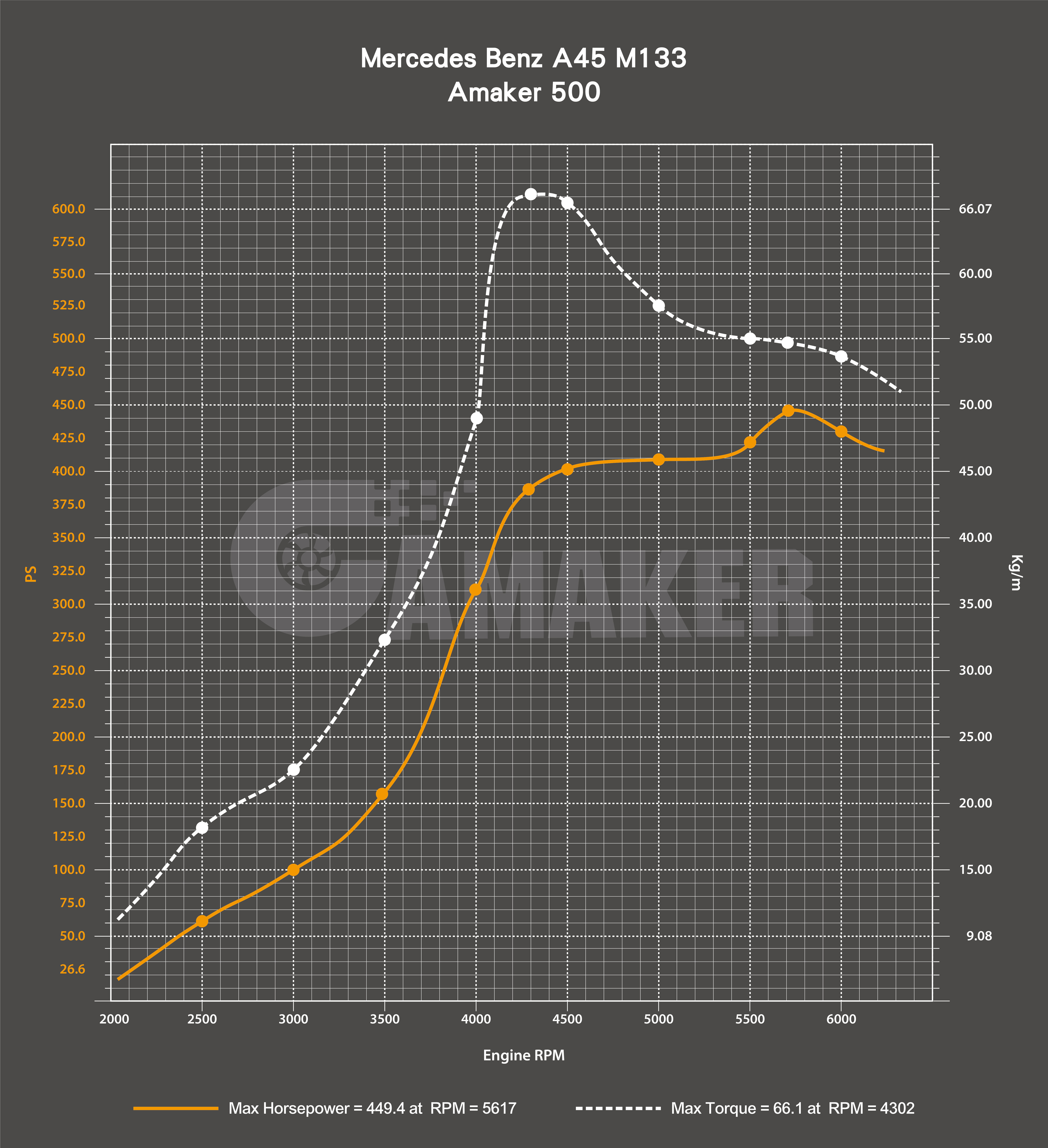 AMAKER 500 是非常適合 BENZ A45 M133 引擎的選擇,尤其適合那些追求快速線軸渦輪增壓以獲得整體功率範圍和高端功率的用戶。儘管在低轉速瞬態特性下可能會有些許不穩定,但在中轉速範圍下能夠提供穩定輸出和持續的高峰值功率,並且有望達到最大 500 匹馬力。